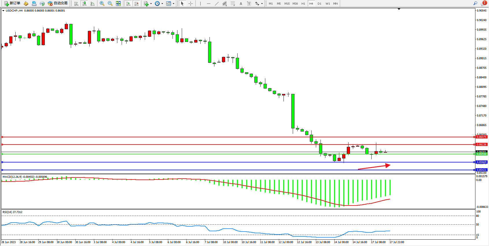 美元瑞郎USDCHF——4小时K线图显示: