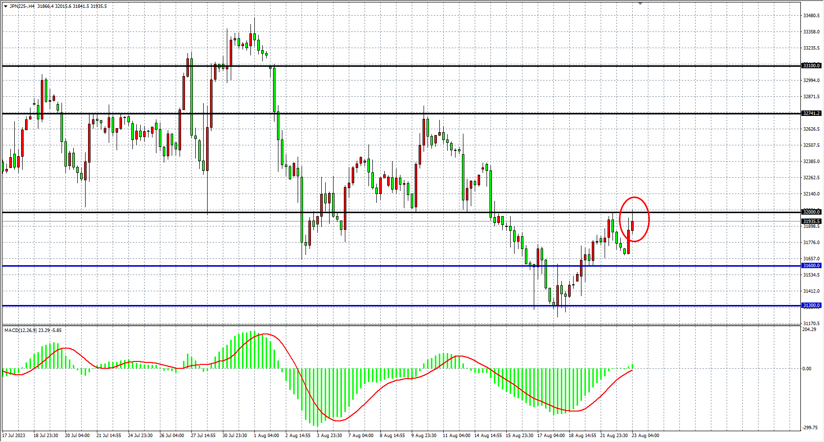4小时图看,日经指数短暂回落后再度上行至32000关口附近,MACD量能上穿零轴之上,短线走势偏强,阻力位关注32000附近。