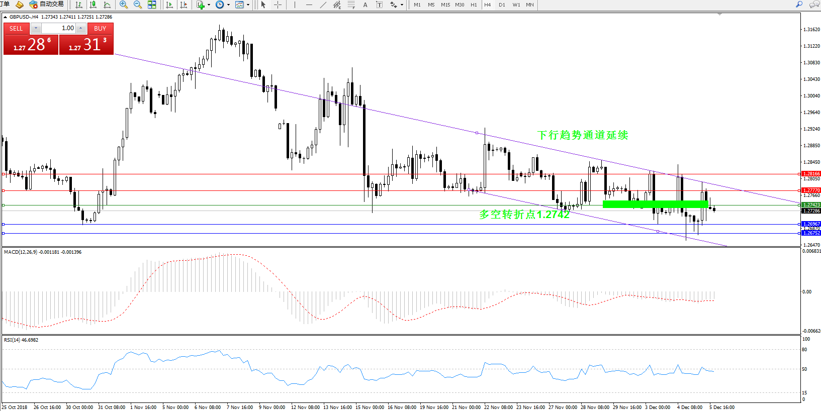 交易策略:1.27423下方看跌,目标1.26967、1.26752