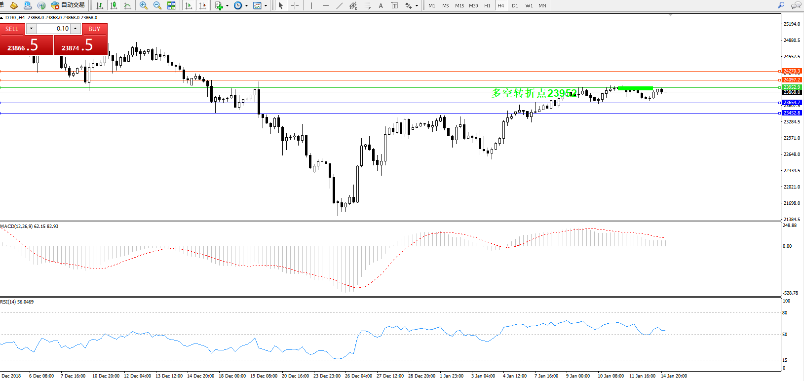道琼斯指数DJ30—— 4小时K线图显示: