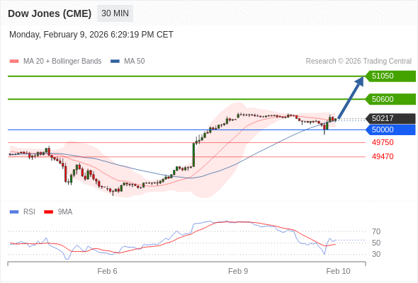 美国道琼斯指数期货 (H6) 当日内: 在50000之上,看涨。