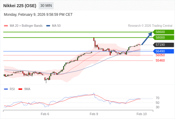 在 56490 之上,看涨,目标价位为 58000 ,然后为 58600 。