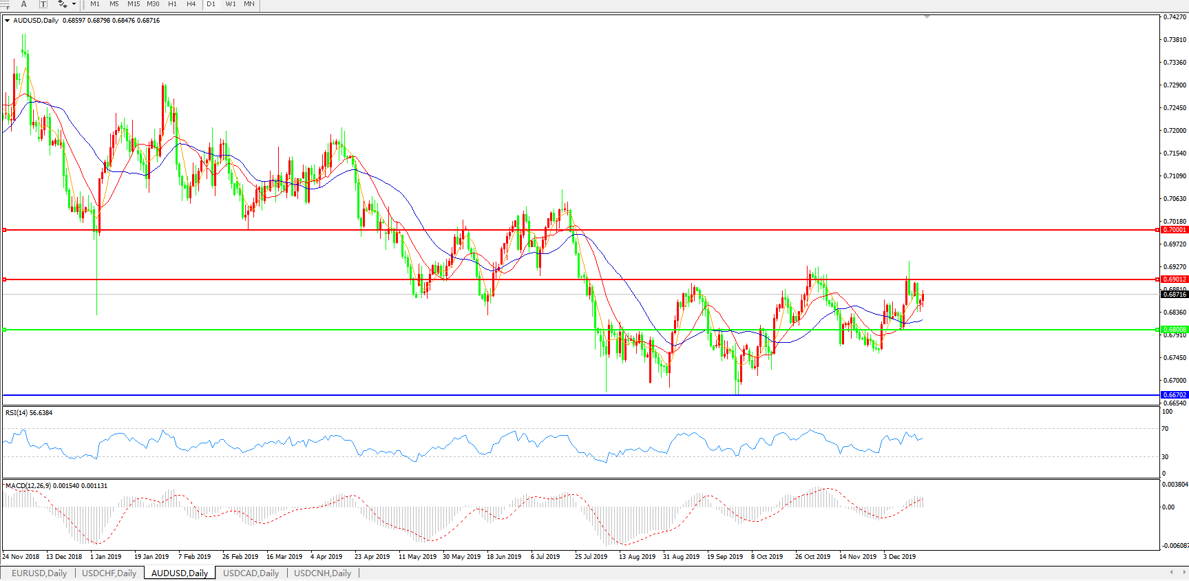 技术面简析:日图均线整体呈多头排列但短期均线有走弱迹象,汇价维持整理态势,MACD拐头上行穿越0轴且量能维持,RSI维持震荡,短线关注0.68关口支撑是否有效,预计汇价大概率将延续整理。