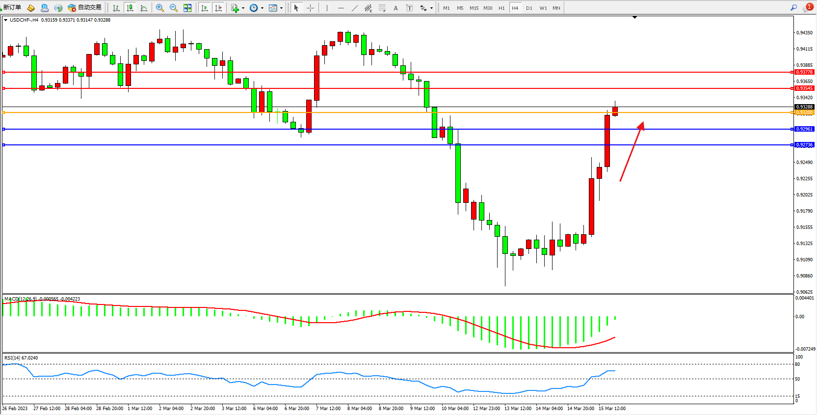 美元瑞郎USDCHF——4小时K线图显示: