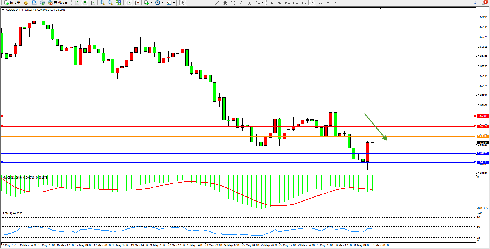 交易策略:0.65151下方看跌,目标0.64875  0.64733